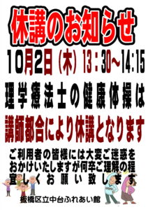 令和7年10月2日(木) 13:30~開催の「理学療法士の健康体操講座」は、都合により休講となります。