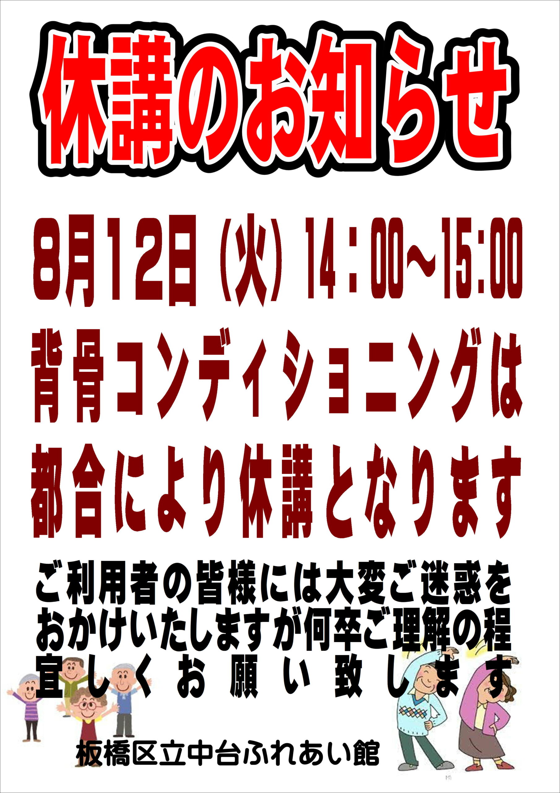 8月12日(火) 14:00~ 開催の「背骨コンディショニング」は、都合により休講となります。