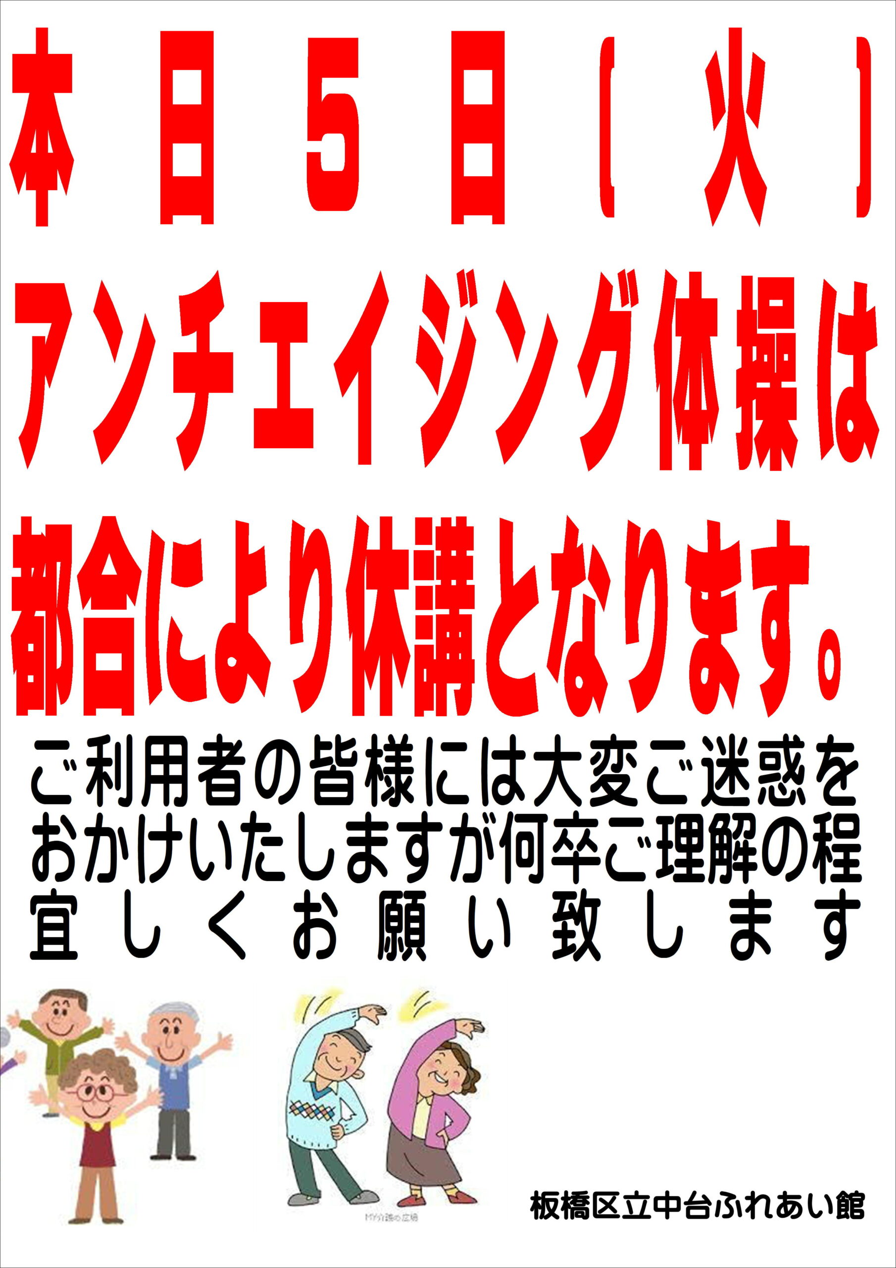 8月5日(火) 13:00~ に開催の「アンチエイジング体操」は、都合により休講となります。
