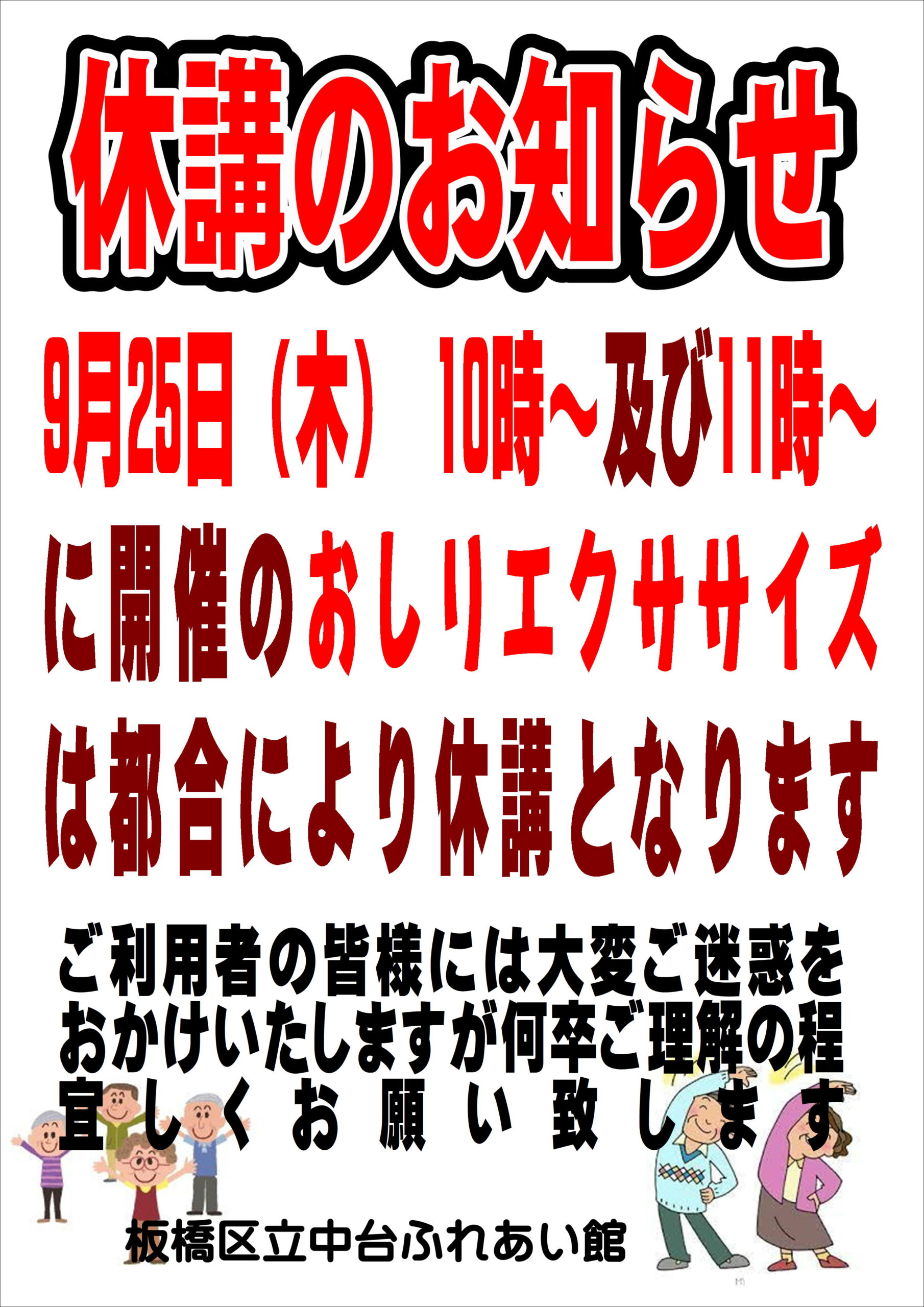 9月25日(木) 10:00~及び11時 開催の「おしりエクササイズ講座」は、都合により休講となります。