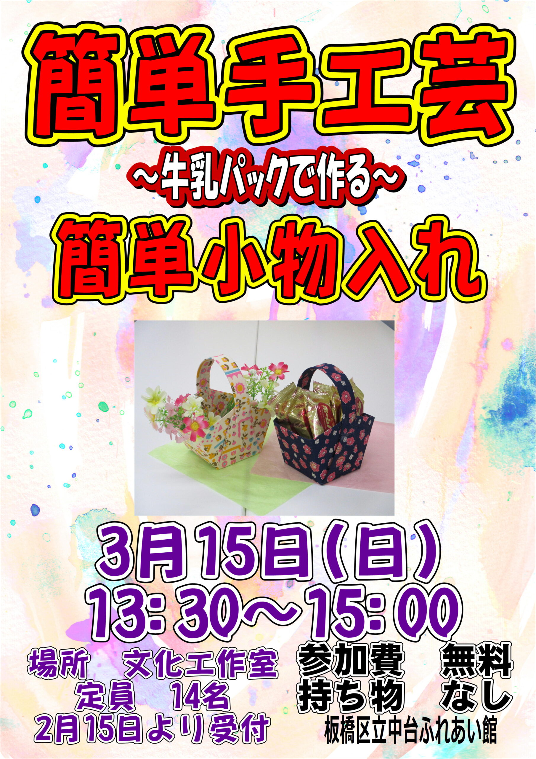 | 簡単!手工芸 | 身の回りにあるものを使って、部屋のアクセサリーなどを作ってみませんか? 今回のテーマは【~牛乳パックで作る~ 簡単小物入れ】 日程:3月15日(日) 時間:13:30~15:00 場所:文化工作室(2階) 定員:14名 参加料:無料 材料費:無し 持ち物:不要です 講師:当館スタッフ ![]() ※2月15日より受付開始します。 |